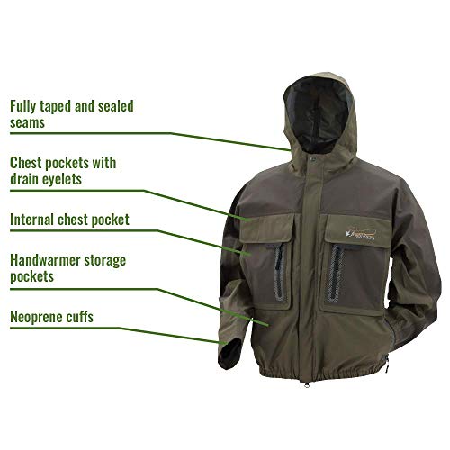 The Frogg Toggs Pilot 3 Guide Jacket is constructed with DriPore 2 Gen breathable technology which keeps moisture out while letting heat escape, preventing the wearer from getting too warm. The material is 100% waterproof with fully sealed seams keeps moisture out. Drop shoulder design is included for great range of motion and freedom of movement. The jacket also has dual multiuse chest pockets with drain eyelets and keyhole patches on pocket flaps that provide ample storage. Dual handwarmer/storage pockets at bottom of jacket and internal chest pocket with zip closure provide added storage.