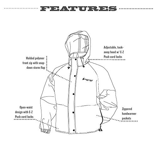 The Frogg Toggs Pro Action Jacket is made with Frogg Toggs’ non-woven Classic fabric with Dri-Pore Gen 2 performance-matched waterproof/breathable technology with fully taped and sealed seams. The new open-waist design is provided for greater versatility, performance and comfort. E-X push hood and hem push-button cord locks ensure a perfectly tailored fit. The jacket also features molded polymer zippers and an adjustable, tuck-away hood. Front zip with snap-down storm flap keeps water out. Zippered hand-warmer pockets are added for comfort and storage.