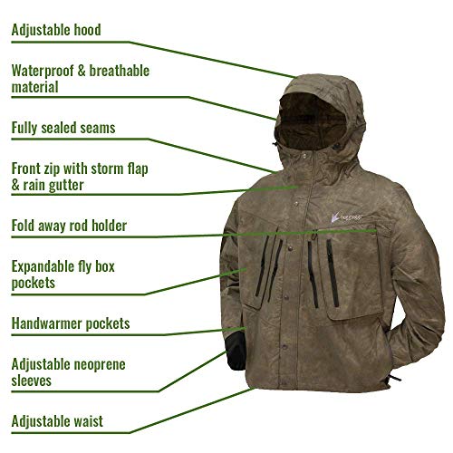 The Frogg Toggs Tekk Toad Jacket is a 100% waterproof and breathable wading jacket, making it perfect for long days fishing. The DriPore 2 Gen technology construction is designed with fully sealed seams to keep moisture out. Adjustable neoprene sleeve openings and adjustable shock cord waistband allows the wearer to achieve a customized and comfortable fit. Expandable fly box pocket on the chest with high-water handwarmer pockets provide ample storage for outdoor necessities. The fold-away rod holder provides extra assistance to fishermen with their hands full.