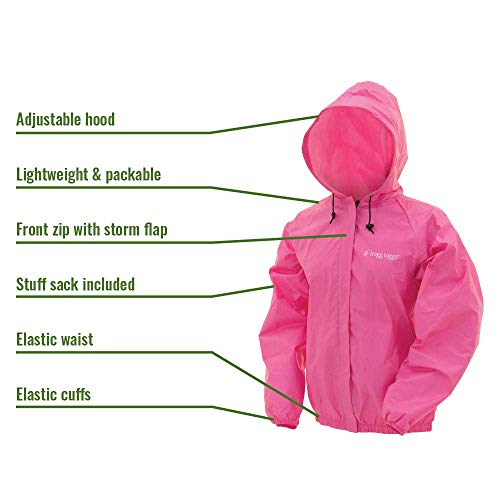 The Frogg Toggs Ultra-Lite 2 Jacket for Women is a lightweight and easily packable rain jacket. The adjustable hood with cord locks provides protection for the wearers head and hair. The jacket features a full front zipper with snap-down storm flap and elastic cuffs to keep moisture out. A stuff sack is also included with purchase of jacket for easy toting. The jacket is perfect for hiking, camping, biking, watching the game, and more.