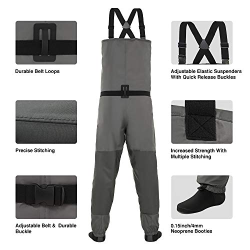 Long Lasting Durability – The Piscifun Breathable Waders feature all of the essentials that anglers need when wading in the river- including reinforced thicker nylon suspenders with great elasticity. The 3-layer polyester construction provides incredible wear resistance. The 4mm neoprene booties fit perfectly and are designed to prevent bunching.